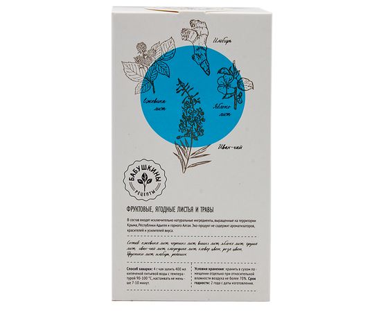 Ежевика лист, черешня лист, вишня лист, яблоко лист, груша лист, иван чай лист, смородина лист, клевер цвет, роза цвет, брусника лист, имбирь, репешок